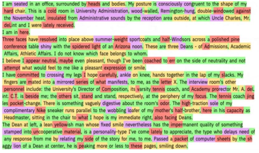 GLTR trabaja de la siguiente manera: halla las palabras que deberían aparecer en cada una de las palabras precedidas en el texto. En la imagen que ilustra este artículo, las más predecibles están en verde, las menos predecibles en amarillo y rojo, y las de plano prácticamente no predecibles, en morado. Cuando se probó con un texto creado con el algoritmo de OpenAI, se encontró una gran predictibilidad. Los artículos de noticias y «abstracts» científicos contienen más sorpresas.