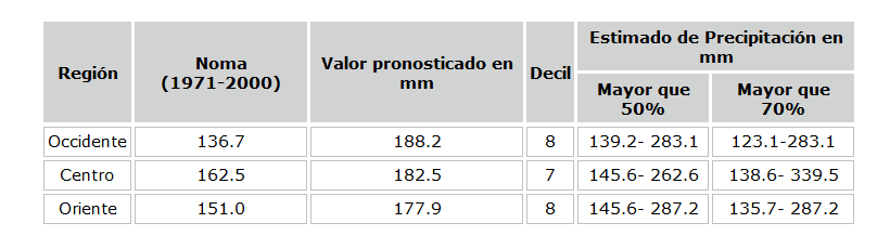 Valores de precipitación previstos para el mes de octubre de 2019: