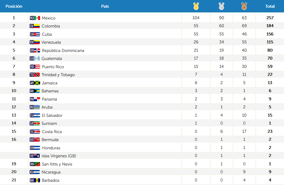 En el segundo lugar, está Colombia, con 55 medallas de oro, una más que Cuba, con la que desde ya libra una pugna por el subcampeonato de los Juegos.