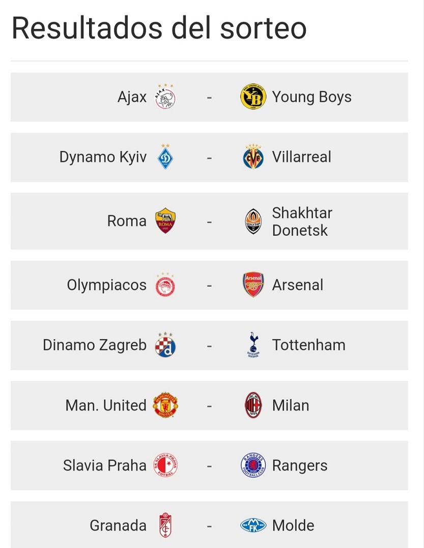 En otro emparejamiento, el Villareal, verdugo en dieciseisavos del Salzburgo, se medirá ahora ante el Dinamo de Kiev, mientras que otro equipo español, el Granada tendrá en el Molde noruego a un rival asequible en aras de seguir avanzando en la competición. Será la primera vez que ambos conjuntos disputarán esta fase.