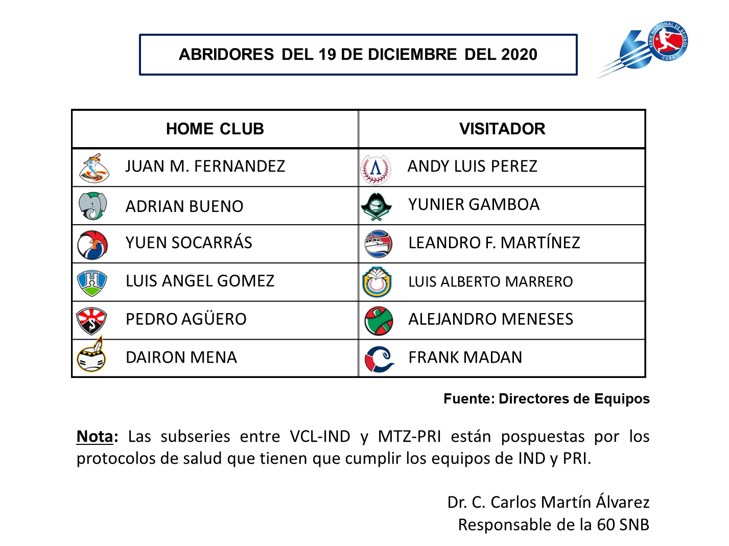 Esa es la nota lamentable de los últimos días: el impacto de la pandemia del nuevo coronavirus en un grupo de muchachos, quienes, según los partes emitidos por los directivos del béisbol y fuentes del propio conjunto habanero, evolucionan bien, pero los protocolos establecidos por el Ministerio de Salud Pública (MINSAP) indican aislamiento para los contactos, por lo cual fueron suspendidos los juegos dos y tres de la subserie entre Industriales y Pinar del Río, y ambos elencos tampoco saldrán al terreno este fin de semana.