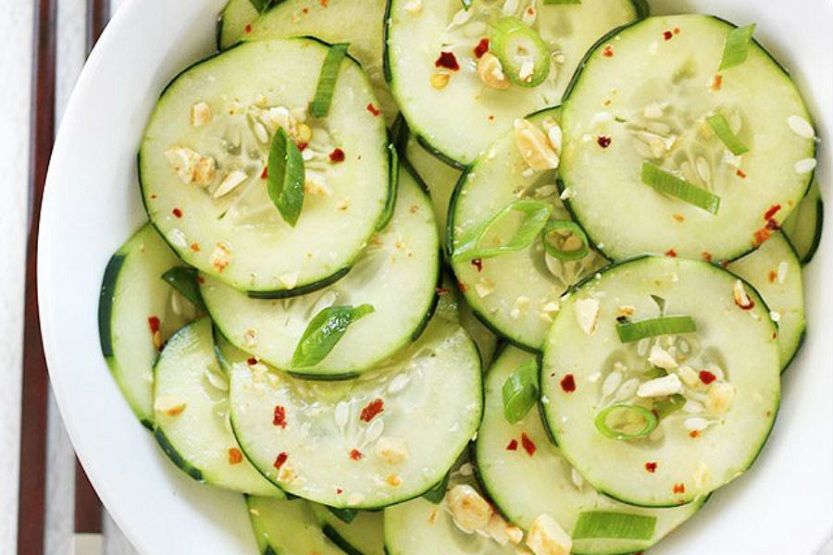 - Aliñar las ruedas de pepino utilizando el aceite y el vinagre, añadir sal a gusto y remover bien para que se incorpore el aliño.