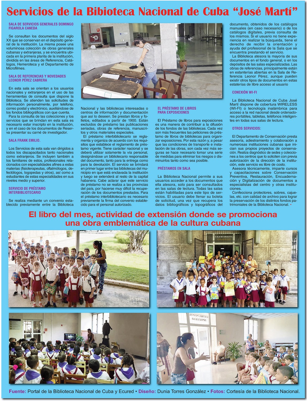 “Las bibliotecas actuales se han dinamizado. La Nacional, por su parte, también trabaja con la comunidad, a pesar de que normalmente las bibliotecas nacionales en el mundo no lo hacen. Dentro de nuestra institución existe una biblioteca pública, la sala Circulante María Teresa Freyre de Andrade, lleva este nombre en honor a la primera directora luego del triunfo de la Revolución. Desde esta sala se realizan las actividades comunitarias, entre las que se destaca El libro del Mes. Se efectúa gracias a la iniciativa del Instituto Cubano del Libro, que escoge el ejemplar que se promoverá en las escuelas, en la Calle de Madera de La Habana Vieja, en la Biblioteca Nacional y en las bibliotecas públicas de la isla. Este libro se edita y se imprimen los ejemplares para estos fines. Todos los meses es un libro diferente, este mes le corresponde a Breve historia del Himno Nacional de Cuba”, puntualizó la especialista.
