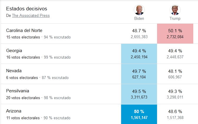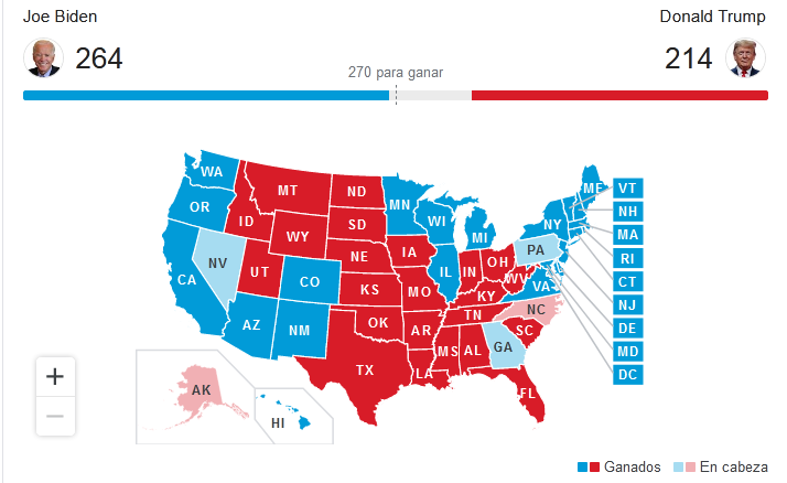 Todavía quedan seis estados por definirse: Arizona, Georgia, Nevada, Pensilvania, Carolina del Norte y Alaska. En los cuatro primeros Joe Biden gana por un estrecho margen que parece irreversible, por lo que se acerca considerablemente a los 270 votos electorales que definen la victoria. Hasta el momento tiene 264 de ellos, según reporta la agencia estadounidense AP.