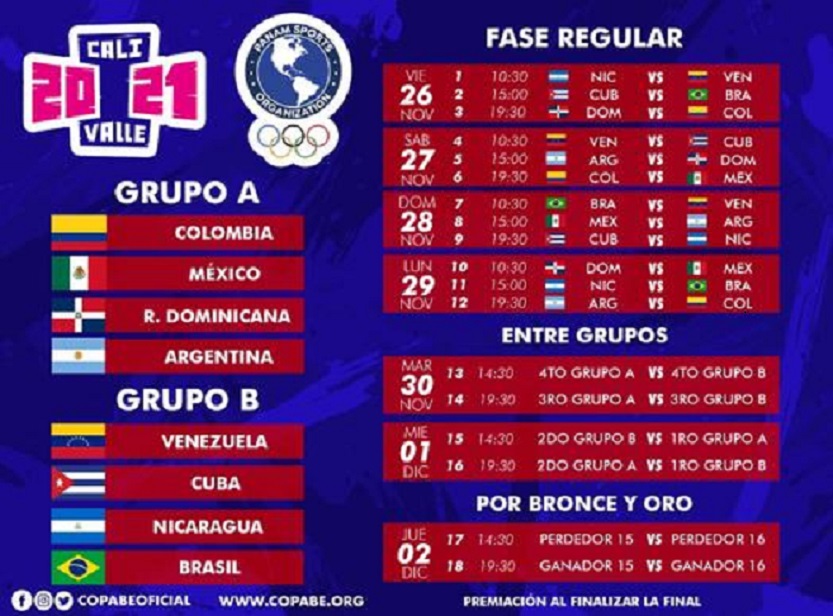 En Barranquilla, sede de la competencia, se darán cita las representaciones de Argentina, Brasil, Colombia, Cuba, República Dominicana, México, Nicaragua y Venezuela, organizados en dos grupos. El puntero de cada llave se cruza con el segundo de la otra y los ganadores van luego por el título y los perdedores por el bronce, juegos finales previstos para el dos de diciembre.