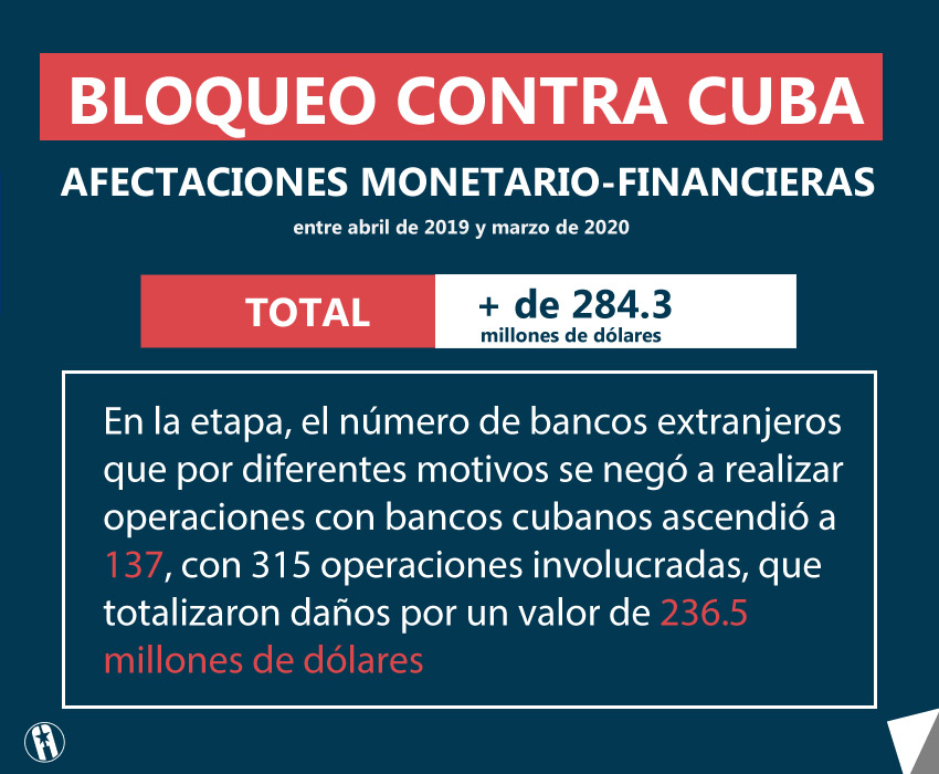 Intimidadas por el bloqueo, con temor a posibles sanciones en su contra, durante abril de 2019 y marzo del 2020, varias entidades bancarias y financieras extranjeras cesaron sus negocios con Cuba. De esa manera las transacciones entre nuestro país tanto para pagar importaciones como para ingresar divisas por las exportaciones se vieron afectadas. Asimismo, el envío y recepción de documentos bancarios a través de agencias de mensajería.