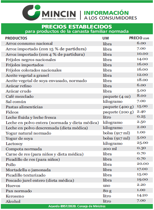 A partir de los días 20 y 23, se estará vendiendo una libra adicional de arroz, que ya tendrá los nuevos precios y el día 30 se comenzará la venta de la canasta familiar normada del mes de enero, como habitualmente se realiza en esta etapa del año; la venta se realizará a precios sin subsidios.