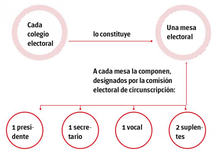 En cada colegio se constituye una mesa electoral el día de las elecciones, la cual está compuesta por: un presidente, un secretario, un vocal y dos suplentes, designados por la comisión electoral de circunscripción.