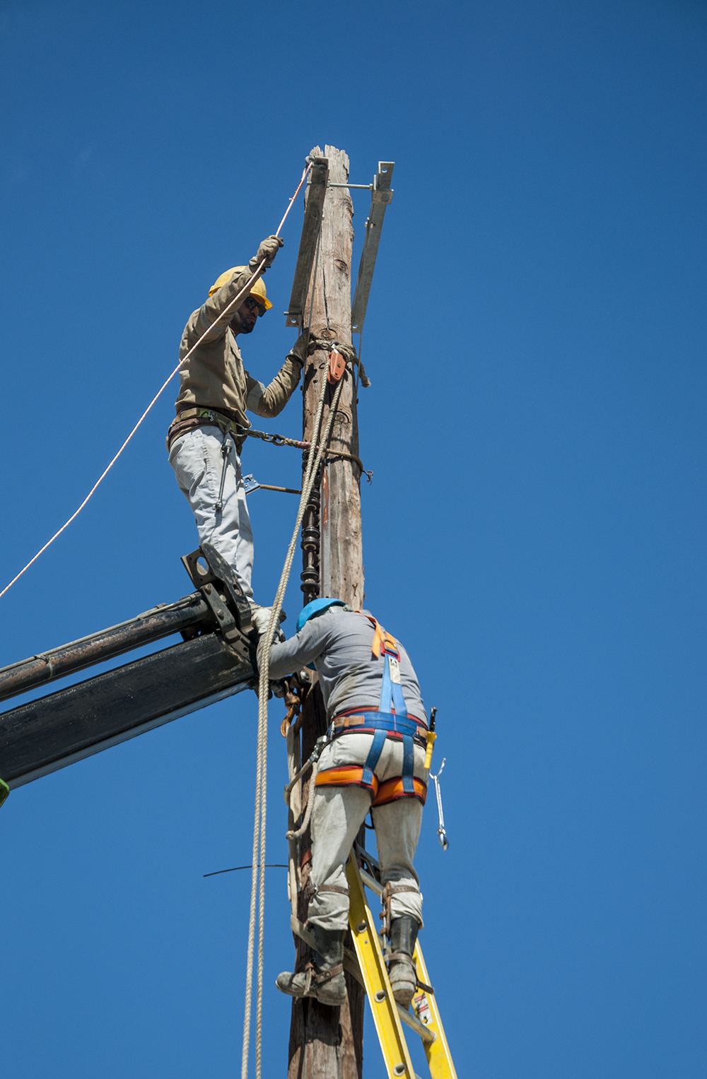 Desde la cima de un poste, dos jóvenes piden un cambio de barrenas para un taladro. Orlando se las alcanza y nos habla del cuidado con que se trabaja para cambiar los cientos de transformadores que parecen latas de refresco aplastadas. Si tuviéramos un drone en las manos, nos sería imposible diferenciar a Carlos, a Orlando o al resto de linieros que ahora mismo trabajan sin descanso, hasta que la luz solar les permite, para devolver la electricidad a estos hogares. “Estamos aquí para eso”, nos dice Carlos mientras nos extiende la mano.