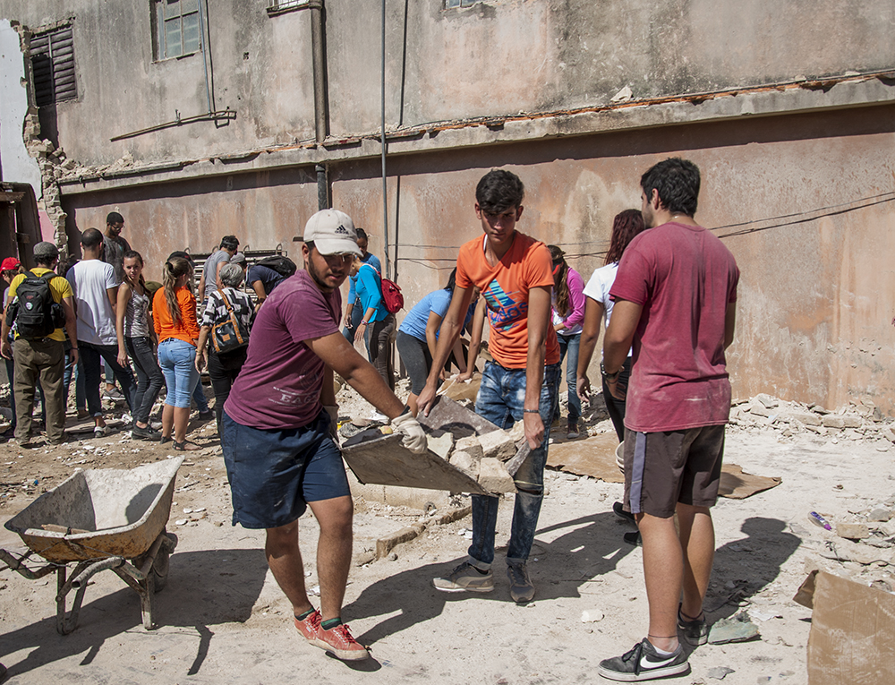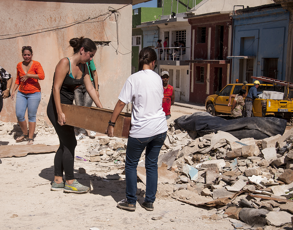 En una esquina hay un grupo de jóvenes recogiendo escombros. Una señora ha brindado las gavetas de su escaparate para que las utilicen como carretilla. Otra se les acerca con un termo de café y unas tacitas. El tornado pasó cerca de la casa de la abuela de Lil María Pichs, estudiante del Instituto Superior de Relaciones Internacionales. Ella sintió la magnitud de los vientos y temió, como el resto de los vecinos. Ha venido toda la semana para ayudarlos, y estos, a su vez, se organizan por turnos para atenderlos lo mejor posible.