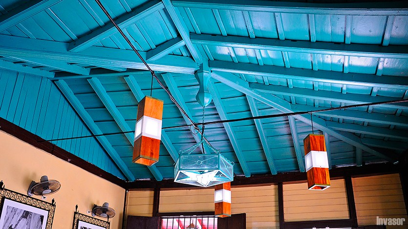 En La Fonda, un pinjante central une las convergencias de las vigas (toda la viguería es lisa, sin lacerías, excepto por las ranuras o estrías aplicadas a las alfardas y pares).