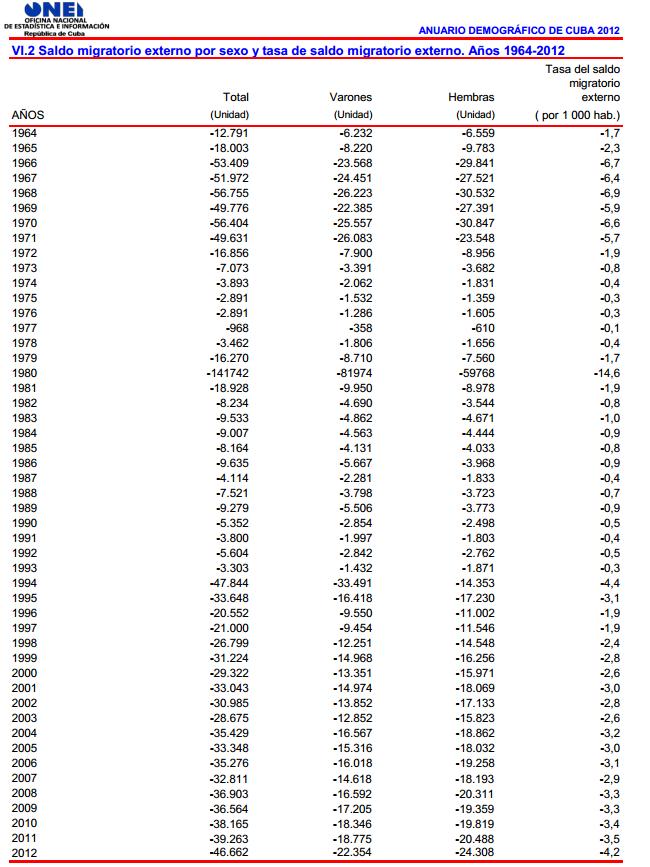 Por otra parte, en el caso de las migraciones, y fundamentalmente la migración internacional, desde 1930 esta variable ha sido negativa. Según datos ofrecidos por el Centro de Estudios Demográficos, entre 2000 y 2012 estos valores estuvieron entre -2,6 y -3,4 personas perdidas por cada mil habitantes (es decir, entre 20 000 y 39 000 individuos). Y como agravante de tal situación ha aumentado la cantidad de jóvenes, las mujeres y personas de elevado nivel de escolaridad que emigran del país, mientras que se mantiene Estados Unidos como principal receptor.