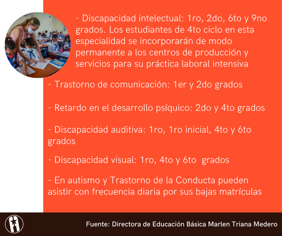 En el caso de la Educación Especial, algunos grados tendrán prioridad por especialidades. Si no pudieran abrirse determinadas instituciones cuando comience el curso de forma presencial, estos niños continuarán su formación en las instituciones educativas de la Primaria o Secundaria básica más próxima a sus viviendas.