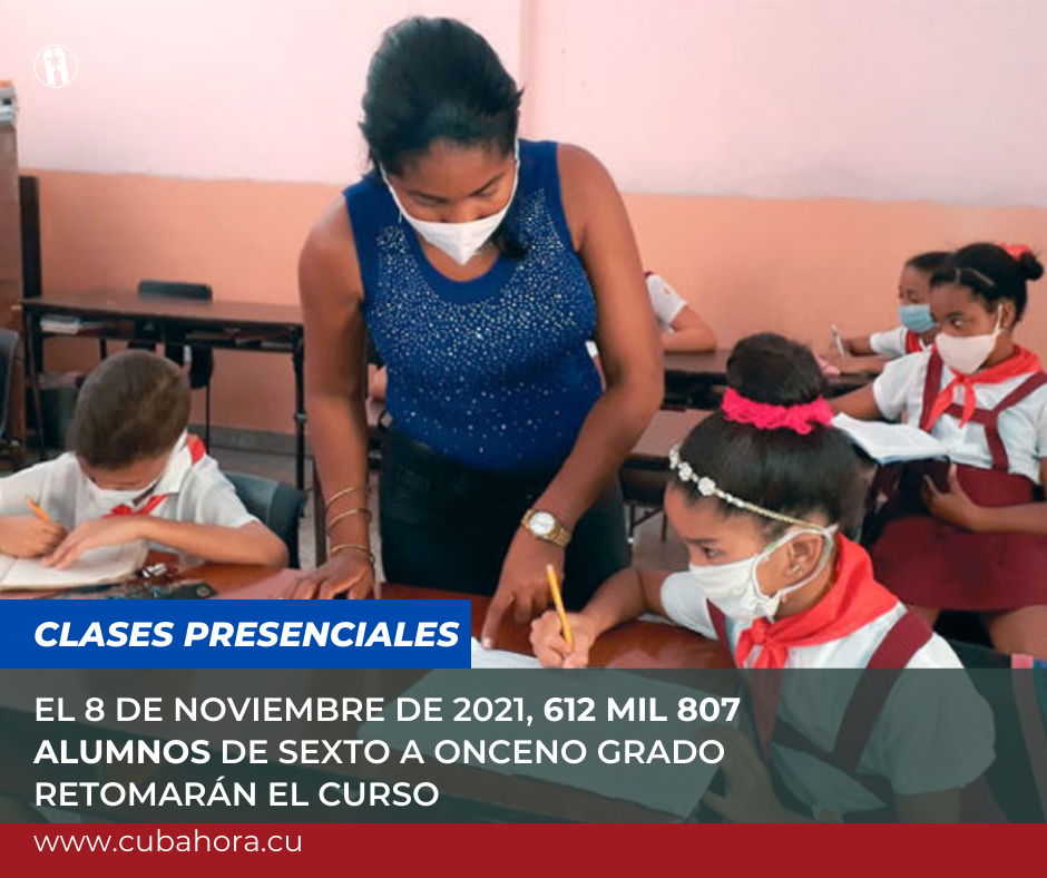 Este 8 de noviembre se incorporan los alumnos de sexto a onceno grado a las aulas y el próximo 15 de noviembre lo harán los niños de prescolar a quinto grado de primaria, con esto ya en toda Cuba se retomarán las tan esperadas clases presenciales del curso escolar.