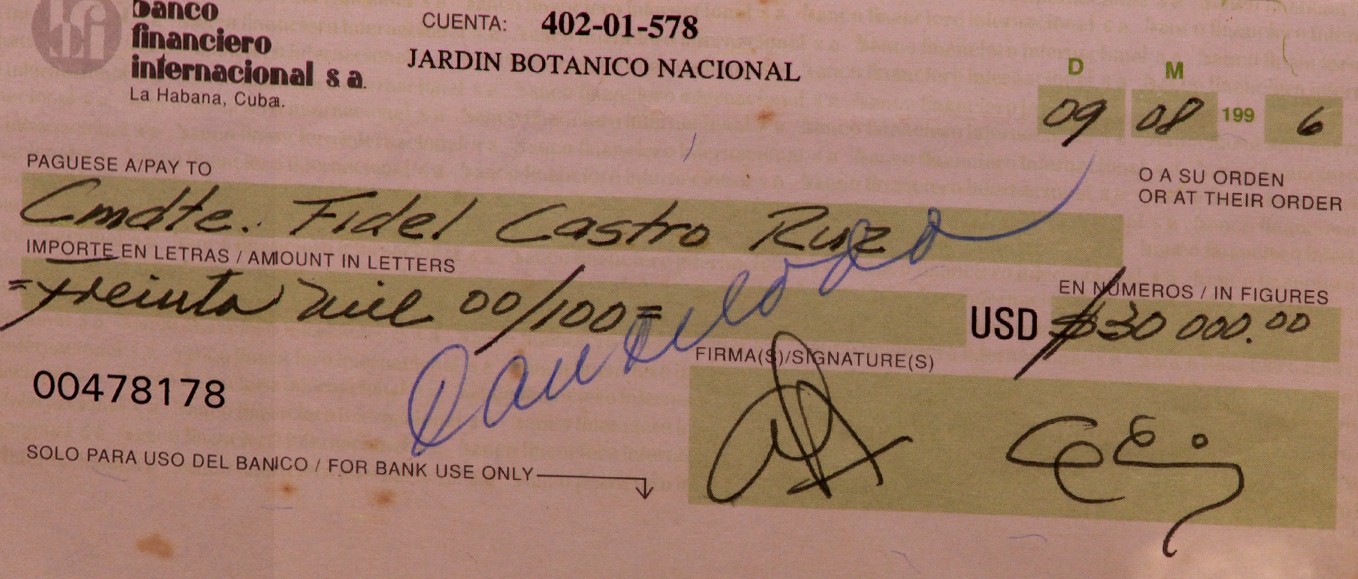 Fueron varios los cheques que emitió el Jardín Botánico; pero el 27 de febrero de 1997 Fidel canceló el último y escribió una nota: “se le asigna al Jardín Botánico”. Ya el país estaba en plena crisis económica y él prefirió que el Botánico dispusiera de ese dinero para enfrentar las complejas circunstancias que se vivían y las esperadas para los próximos años. De esa forma, se canceló uno de los canales en que se movía el dinero entre el Jardín Botánico y Fidel.