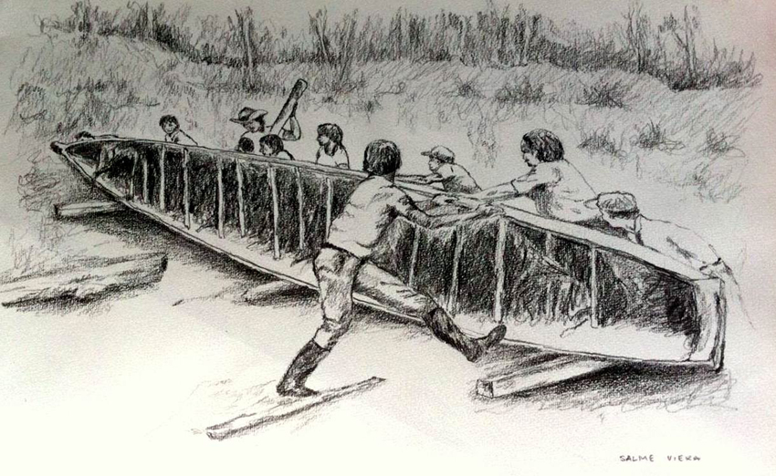 Dibujo de la canoa "Simón Bolivar" realizado por el pintor y expedicionario Fernando Salme. (Foto. Cortesía del Autor).