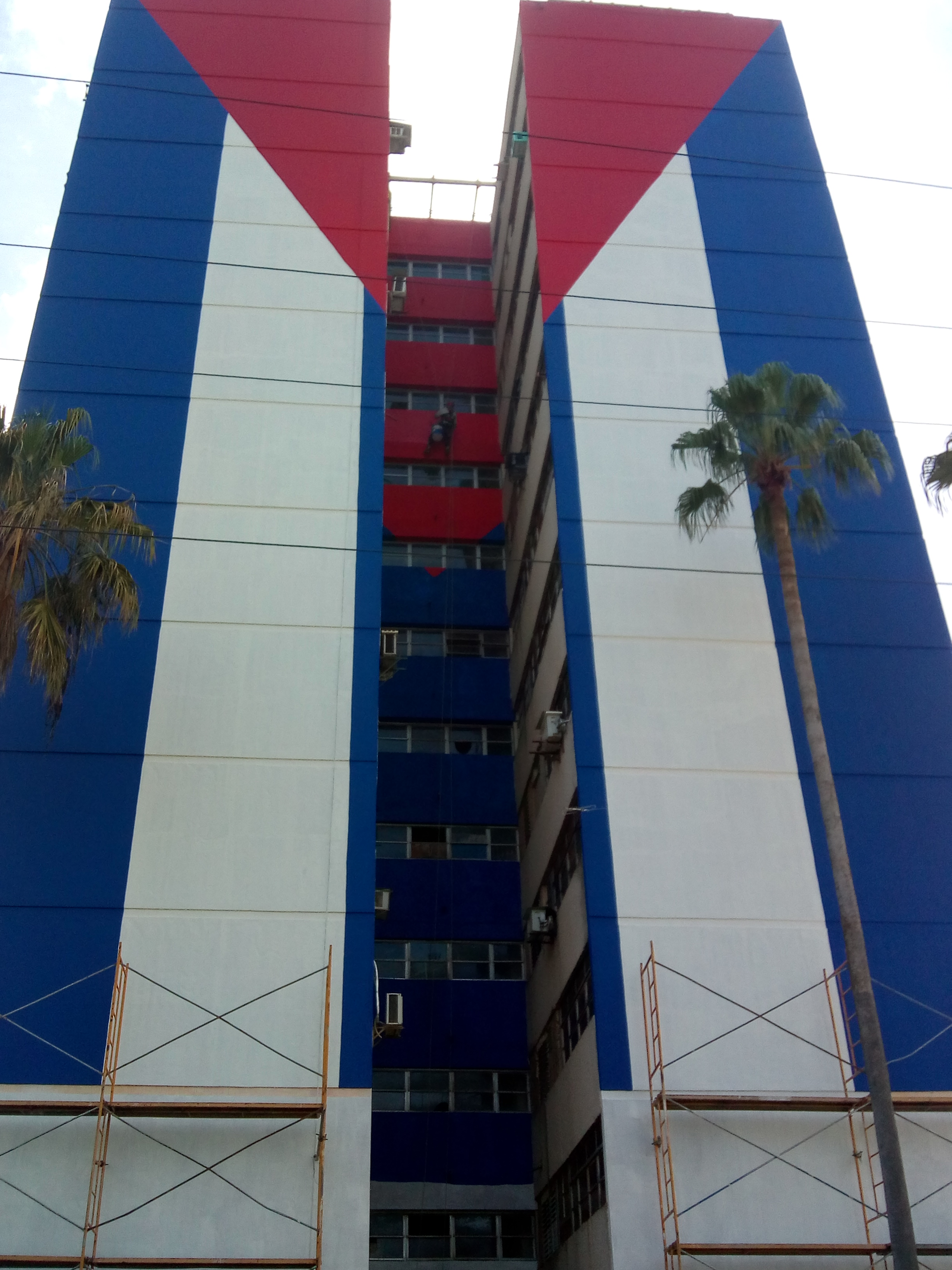 La enseña nacional de 44 metros de alto por 18 de ancho engalana el costado izquierdo de uno de los edificios más altos de la ciudad de Matanzas. Los vecinos del edificio del Polinesio se sienten agradecidos porque el pintor escogió el lugar donde viven para este empeño.