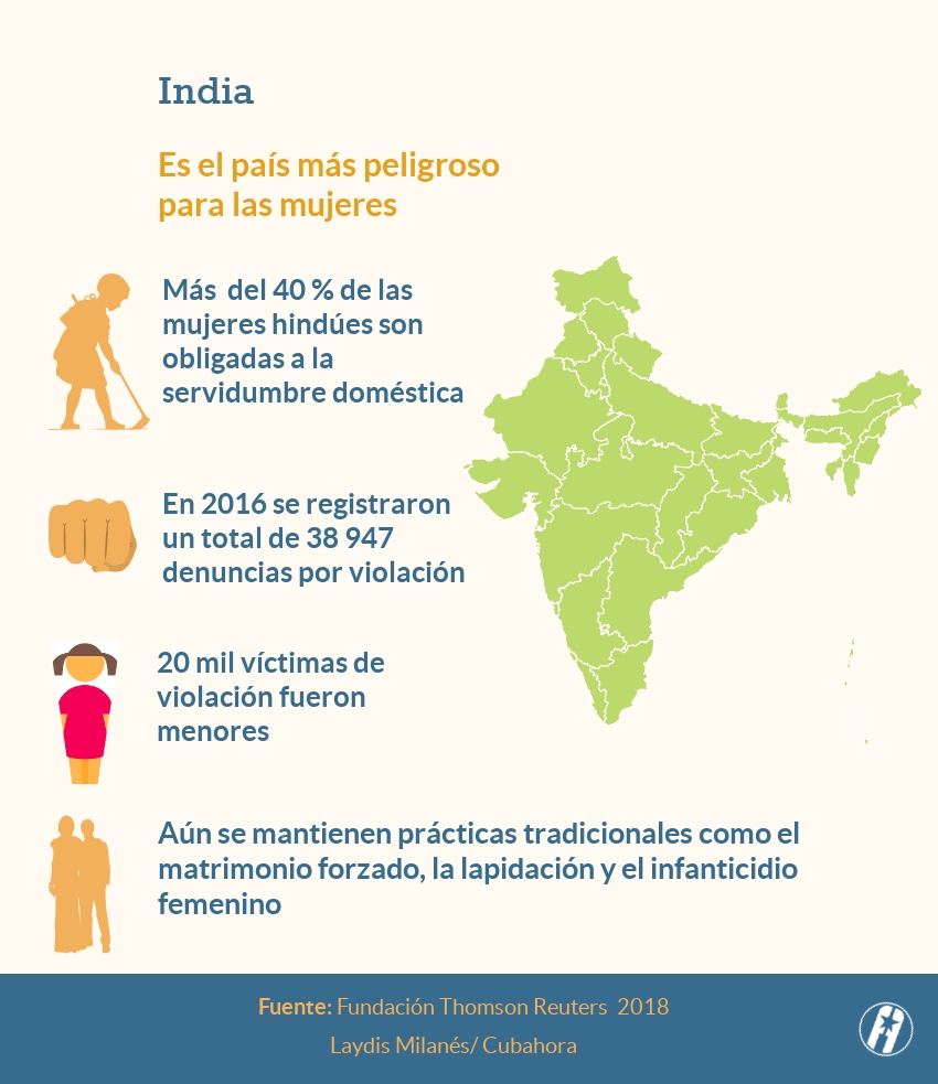 Según una encuesta realizada por la Fundación Thomson Reuters, el país más peligroso para ellas es la India, donde el tráfico ilegal afecta a millones de mujeres, mientras que para sorpresa de muchos, Estados Unidos ocupa el décimo lugar en dicha lista, siendo en términos de violencia sexual el tercero.